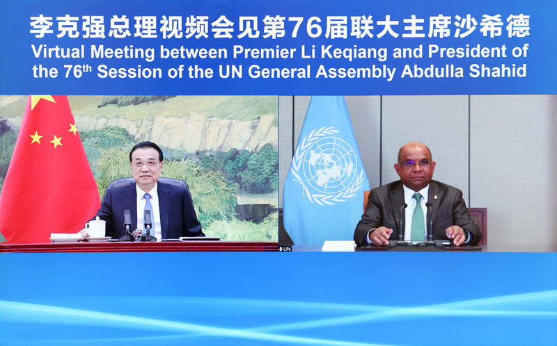 11月26日下午,国务院总理李克强在北京人民大会堂以视频方式会见来华访问的第76届联合国大会主席沙希德。新华社记者 刘彬 摄