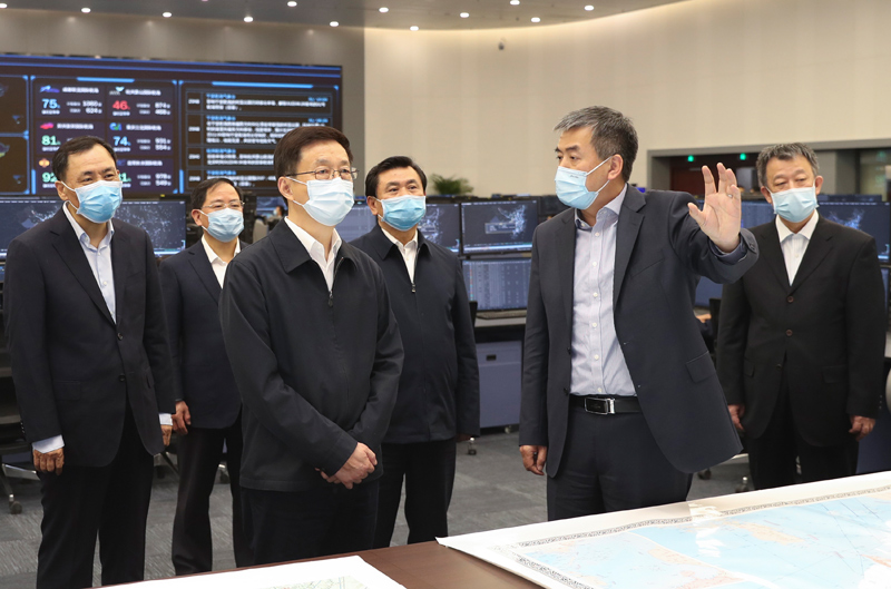 3月31日,中共中央政治局常委、国务院副总理、中央空中交通管理委员会主任韩正前往民航局空管局运行管理中心、航空气象中心、航行情报服务中心,调研了解我国民航运行管理、气象服务、航行情报服务等情况。这是韩正在民航局空管局运行管理中心调研。新华社记者 丁海涛 摄