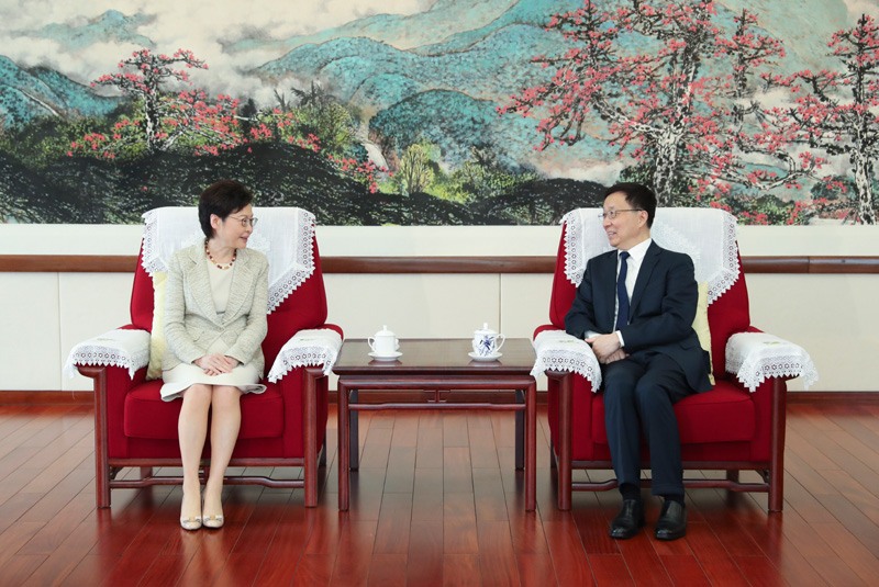 4月22日,中共中央政治局常委、国务院副总理韩正在广州会见前来参加粤港澳大湾区建设领导小组会议的香港特别行政区行政长官林郑月娥。新华社记者 姚大伟 摄