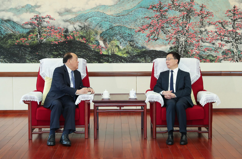 4月22日,中共中央政治局常委、国务院副总理韩正在广州会见前来参加粤港澳大湾区建设领导小组会议的澳门特别行政区行政长官贺一诚。新华社记者 姚大伟 摄