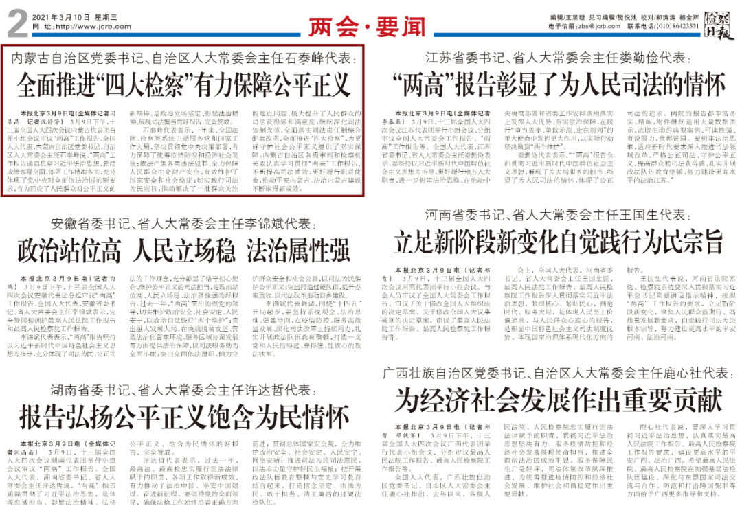 3月10日《检察日报》第2版——内蒙古自治区党委书记、自治区人大常委会主任石泰峰代表:全面推进“四大检察”有力保障公平正义