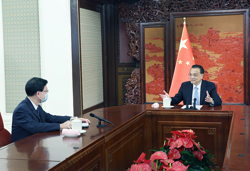 李克强首先祝贺李家超当选并获任命,表示中央政府将一如既往全面准确、坚定不移贯彻“一国两制”、“港人治港”、高度自治的方针,落实中央对特别行政区全面管治权,坚定落实“爱国者治港”,全力支持行政长官和特别行政区政府依法施政、发展经济、改善民生,结合国家所需、发挥香港所长,全力推动香港更好融入国家发展大局,保持香港长期繁荣稳定。