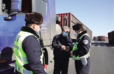 民警在110国道进行检查(记者王璐摄影常静)面对疫情防控和企业复工复产“两线作战”的形势,包头市公安局交管支队将各大队警力最大限度投入到一线,在...