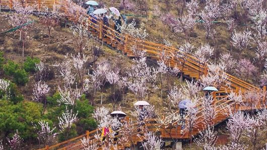 山地美景与城市交相呼应,美丽如画。游客雨中漫步,感受不一样的包头春光。一位家长带着孩子在鲜花中自拍留念。紧挨110国道,市民很方便就能到达昆都仑国家湿地公...