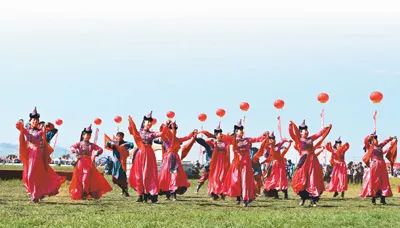 8月6日,赤峰市首届乌兰牧骑艺术展演暨巴林右旗第二十四届那达慕大会上,喀喇沁旗乌兰牧骑正在展演。人民日报记者 赵昊 摄
