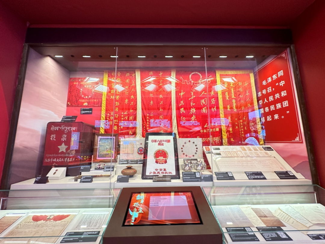 首先就是“铸牢中华民族共同体意识文物古籍展”,这是第一个贯通中华民族共同体形成、发展过程的展览,分为“大一统”“大交融”“大团结”三个单元。其中“大团结”单元通过“开辟新天地”“建设新中国”“奋进新时代”三个篇章,展示大量新民主主义革命时期以来的革命文物,彰显各族人民感党恩听党话跟党走、建设伟大祖国和美丽家乡、维护国家统一和民族团结的精神,展现中国共产党从建立之日起一脉相承的中华民族大团结的深邃思想与丰富实践。展览自去年8月1日展出至今,已接待参观人员13万余人次,成为当前全国范围内进行中华民族史教育的高地和有形、有感、有效铸牢中华民族共同体意识的行业标杆。