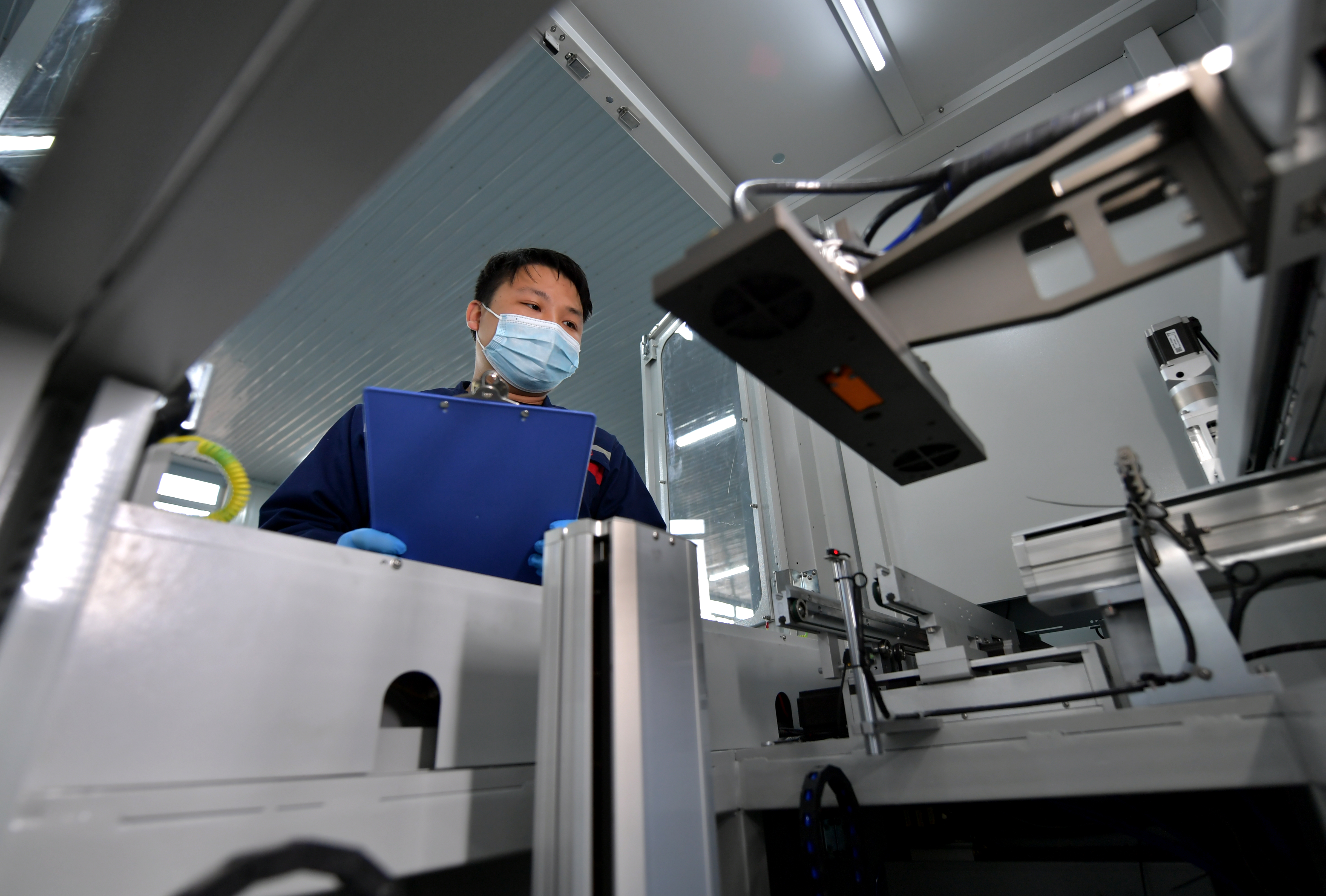 美锦国鸿氢能科技产业园的工作人员正在进行双极板上料。记者 马建荃 摄