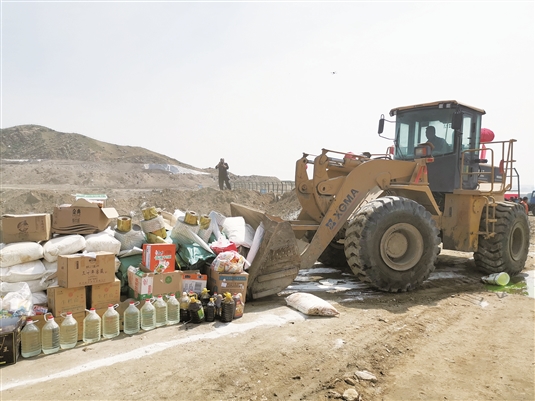 4月23日,在包头市垃圾填埋场,随着铲车的来回作业,一大批有包装的食品、衣服鞋帽、粮食等被推入了垃圾填埋坑,这是自治区在我市组织开展的侵权假冒伪劣商品集中统一销毁行动的一幕。