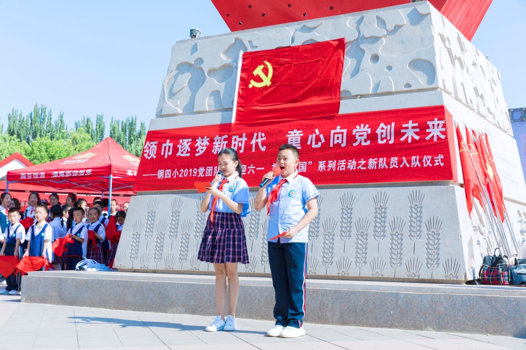多年来,钢四小始终坚持以立德树人为根本任务,以培育时代新人为教育目标,把服务中华民族伟大复兴作为教育的重要使命。在 "六一" 儿童节来临之际,为了给一年级队员们上好第一节思政课,让队员们从小心向党、立志向、爱祖国、爱家乡,5月29日上午,钢四小开展了 "领巾逐梦新时代,童心向党创未来" 2019党团队 "喜迎六一 ·祝福祖国" 新队员入队仪式暨 "传承红色基因·争做新时代好少年" 研学活动。