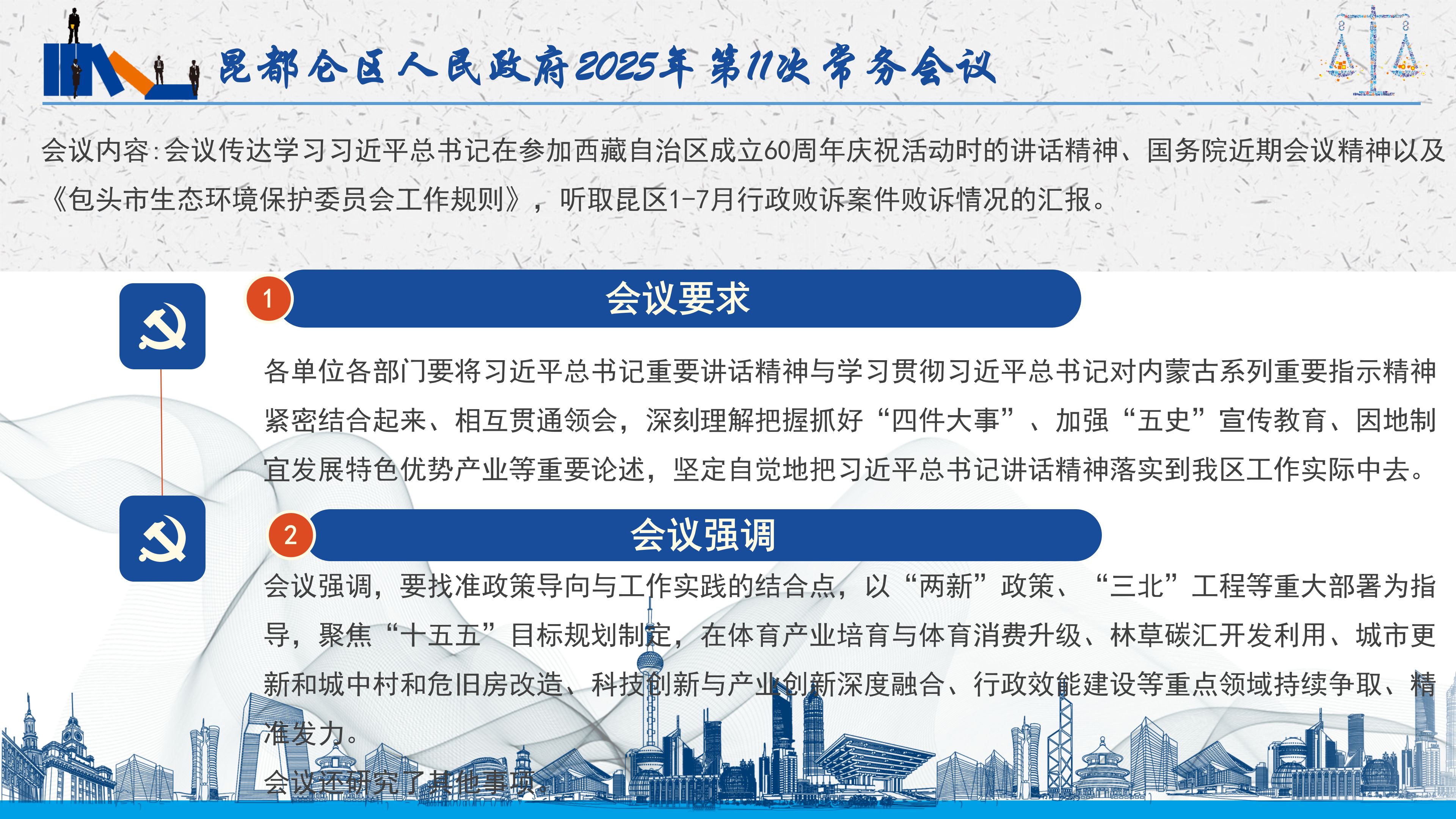 会议传达学习习近平总书记在参加西藏自治区成立60周年庆祝活动时的讲话精神、国务院近期会议精神以及《包头市生态环境保护委员会工作规则》,听取昆区1-7月行政败诉案件败诉情况的汇报。