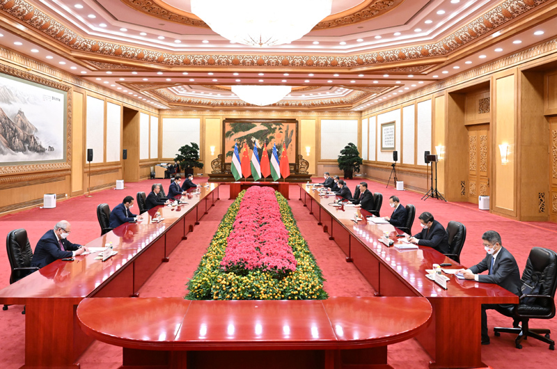 2月5日下午,国家主席习近平在北京人民大会堂会见来华出席北京2022年冬奥会开幕式的乌兹别克斯坦总统米尔济约耶夫。新华社记者 申宏 摄