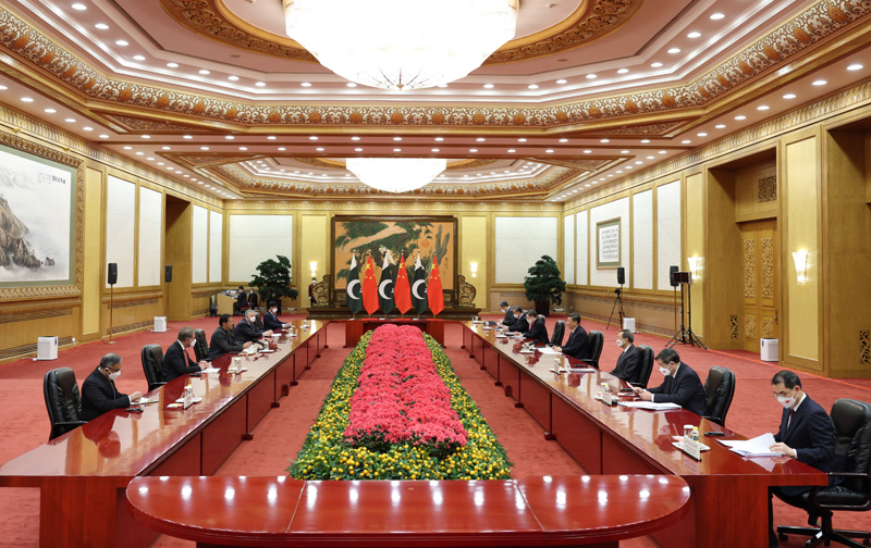 2月6日上午,国家主席习近平在北京人民大会堂会见来华出席北京2022年冬奥会开幕式的巴基斯坦总理伊姆兰·汗。新华社记者 丁林 摄