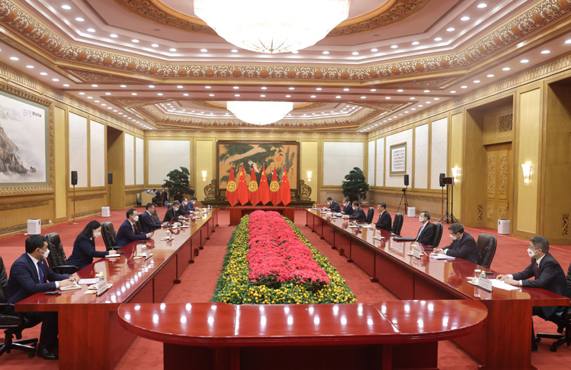 2月6日下午,国家主席习近平在北京人民大会堂会见来华出席北京2022年冬奥会开幕式的吉尔吉斯斯坦总统扎帕罗夫。新华社记者 丁林 摄