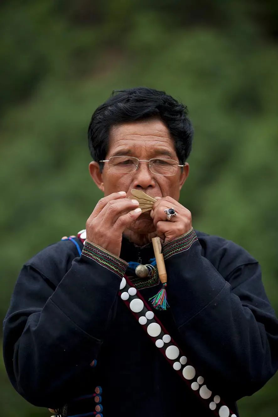 ▲彝族口弦传承人俄的日火在演奏口弦。
