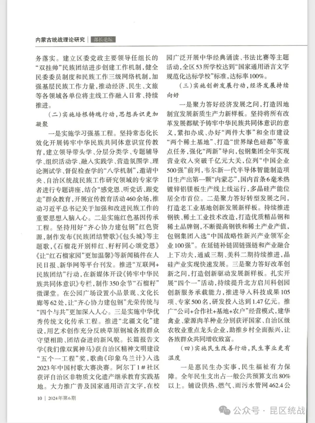 近日,《内蒙古统战理论研究》【总第243期】刊发《昆都仑区民族团结进步创建实践研究》一文。