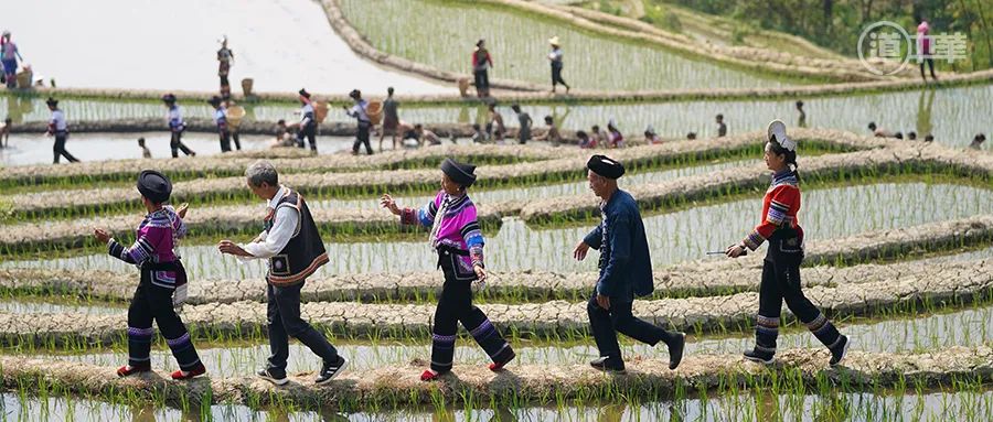 云南红河:哈尼梯田“开秧门”,民众在梯田中起舞。(中新社发 刘冉阳 摄)