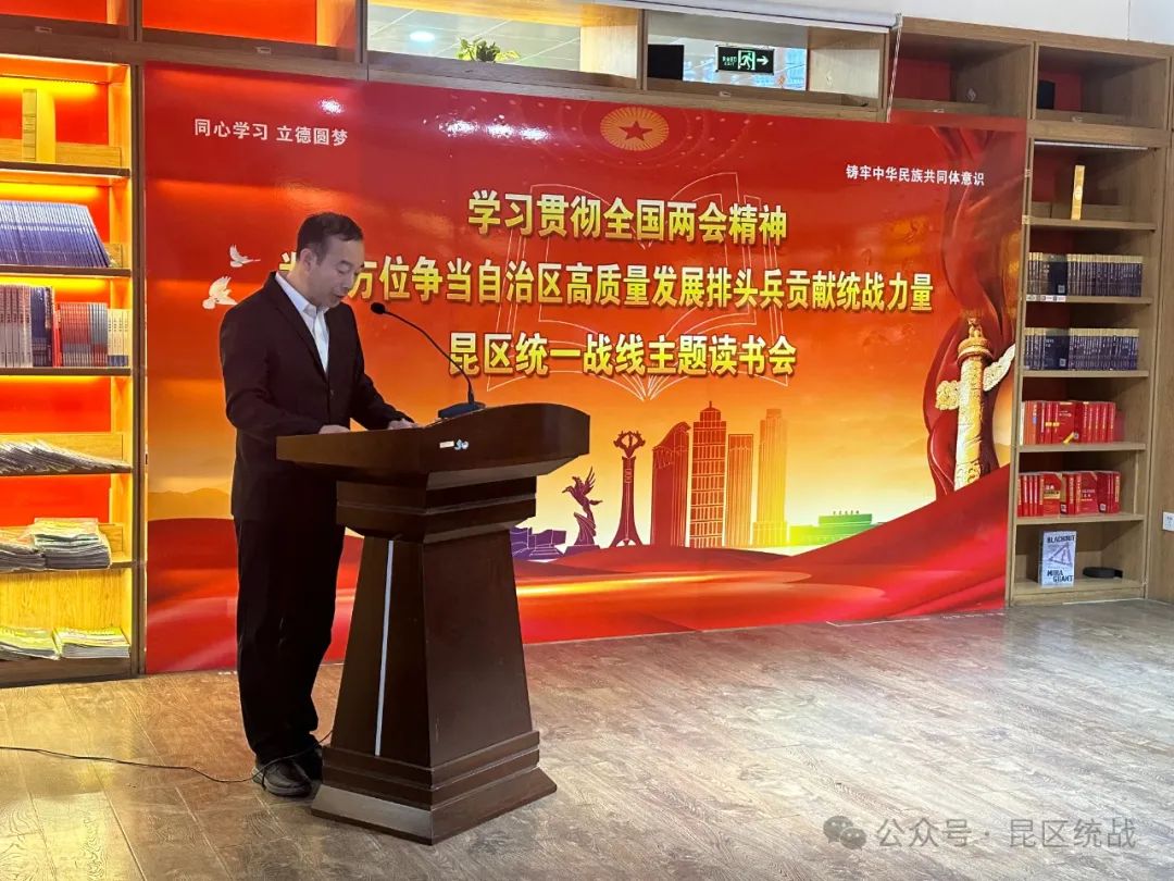 为进一步深入学习全国两会精神,团结带领全区统战成员更加紧密的团结在以习近平同志为核心的党中央周围,不断加强自身建设。4月10日上午,区委统战部在市新华书店举办了2024年第一期“同心学习•立德圆梦”读书会暨学习全国两会精神主题读书会,昆区区委常委、统战部部长张国强、昆区政协副主席刘凤出席活动。昆区各民主党派、知联会、新联会及街镇统战委员40余人参加活动。 读书会上,大家共同观看了《春之声——习近平总书记2024年全国两会纪实》,共同聆听了这场“春天里的盛会”所发出的声音。作为全国人大代表的包头稀土研究院磁材所副所长、民盟昆区总支主委闫宏伟分享了现场参加全国两会的心得体会,并以《满怀希望地为发展新质生产力做出贡献》为题进行发言。随后各民主党派及知联会、新联会代表人士围绕学习全国“两会”精神,结合工作实际进行了交流发言。 会上,张国强勉励各领域统战成员,要深入学习贯彻习近平总书记重要讲话精神和全国两会精神,切实把思想和行动统一到习近平总书记重要讲话精神和党中央决策部署上来,与学习贯彻党的二十大精神、习近平总书记对内蒙古重要指示精神结合起来,更加深刻领悟“两个确立”的决定性意义,增强“四个意识”、坚定“四个自信”、坚决做到“两个维护”。要立足全国两会作出的新部署,围绕发展新质生产力、全面深化改革、推动高质量发展等方面积极建言献策、主动躬身实践。要持续深化昆区统一战线服务全区经济高质量发展“六项同心工程”,通过持续打造工作品牌、强化履职实效,不断提升统战工作对中心大局的贡献率,为全区加快向全国千亿级县市区100强迈进、全方位争当自治区高质量发展排头兵贡献统战力量,以更加优异的成绩迎接新中国成立75周年。